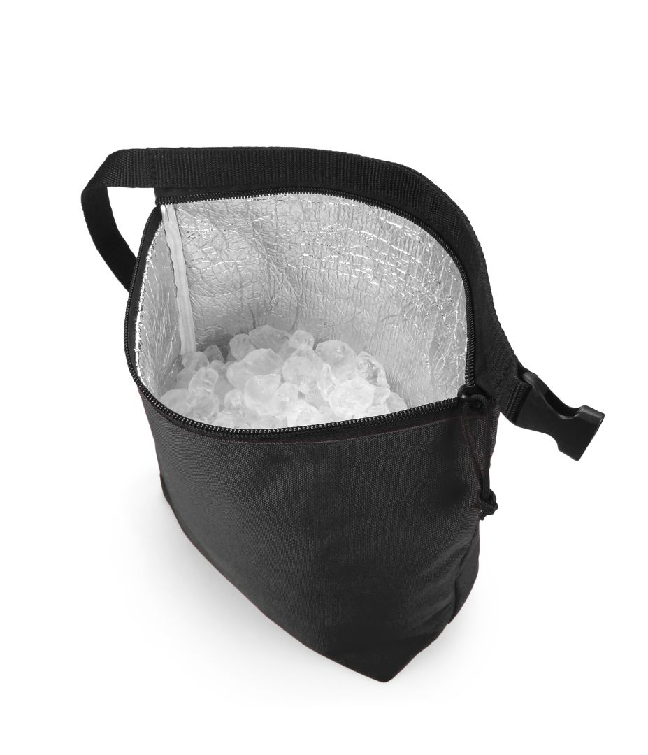 versatile cooling bag; large, padded zipped main compartment; snap closure for various carrying methods