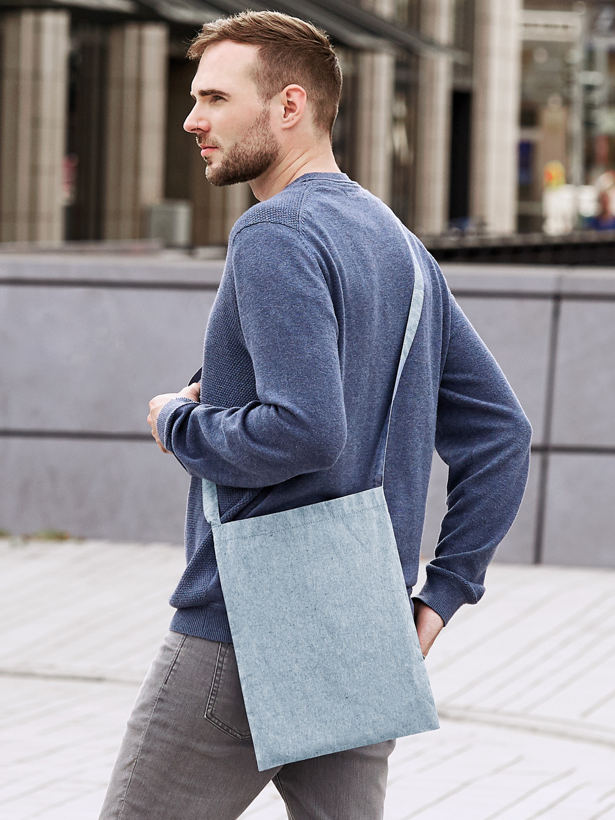 streamlined tote bag made from pre-recycled cotton; ideal for A4 documents; long shoulder strap