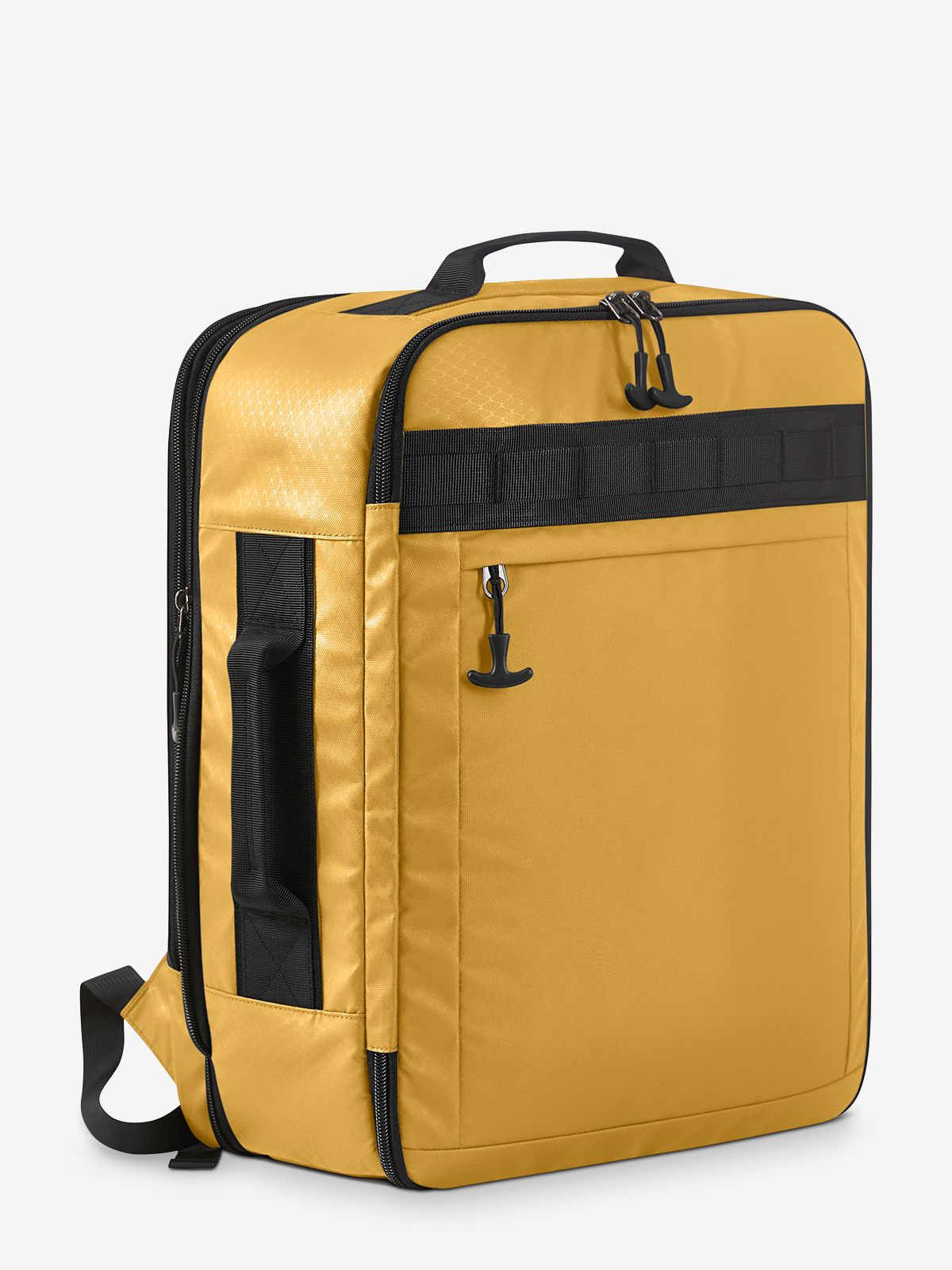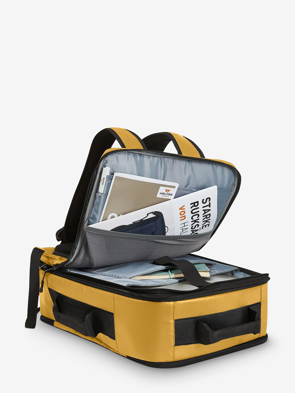 spacious and elaborately crafted business travel backpack; large front zipped pocket and functional loop strap; side slip-in pocket for drink bottles, for example; two handles; large padded main luggage compartment with mesh lid, 2-way zip and side mesh pocket and key strap; two zipped mesh pockets in the main compartment lid; main compartment volume extension; separately accessible 2-way zipped compartment for work equipment: Tablet and notebook compartment, both with velour lining and elastic fastening loop; mesh pocket; slip-in pocket suitable for A4 documents; pen loop; well-padded back carrying system with adjustable chest strap; fastening loop for trolley bar on the back