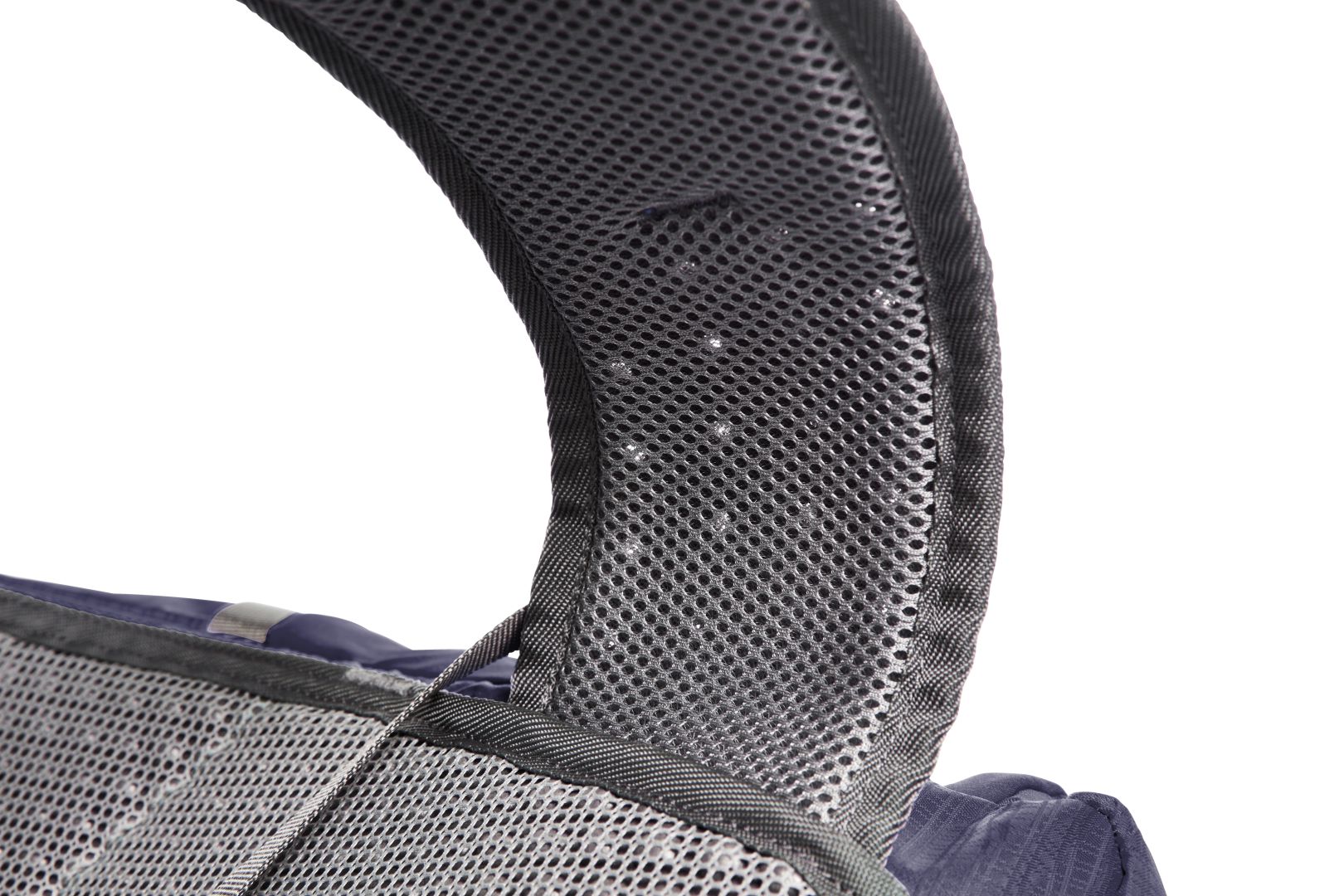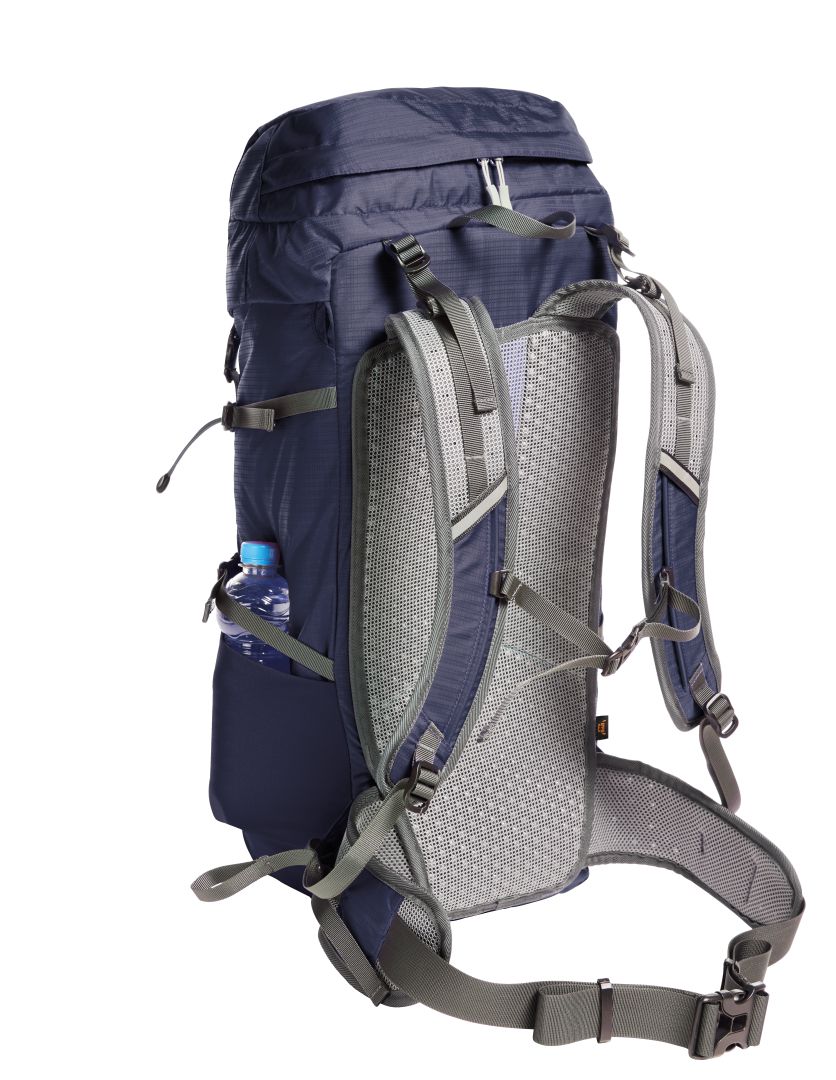 light, functional backpack with ergonomically shaped back, ventilated; carrying system adjustable at the top and bottom; height-adjustable chest strap; padded waist strap; large main compartment with flat inside compartment; side openings (right & left), suitable for headphones or tube for the additionally available drinking system (article 1812216); hook and loop tape loop for securing the drinking tube; main compartment extension with pull cord; additional securing strap under the cover flap; cover flap with side-release buckles and 2 zipper compartments; 2 side pockets; side lashing straps; hiking sticks fixing; base compartment with rain cover; handle