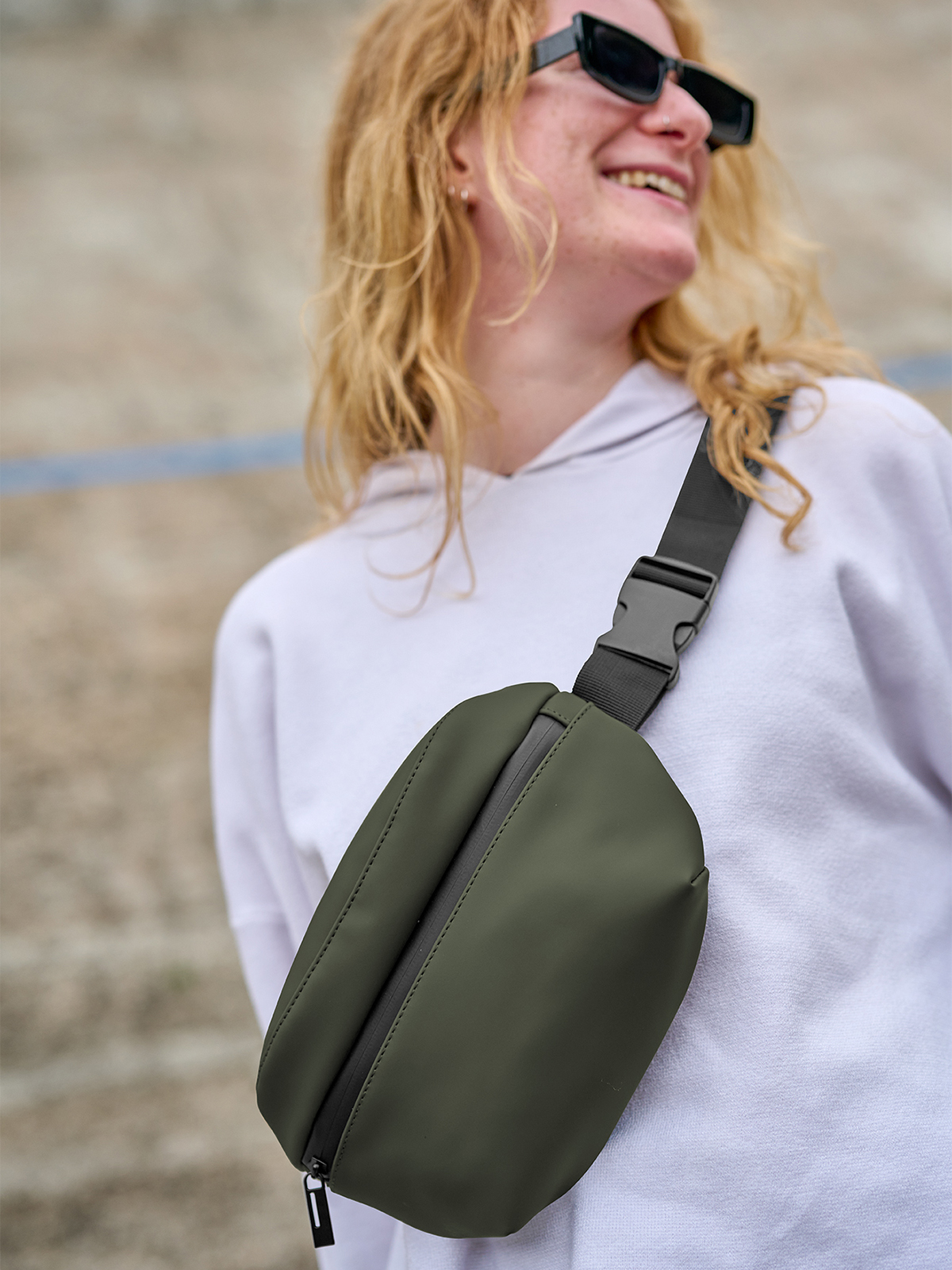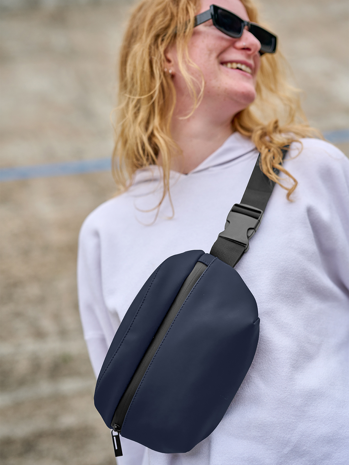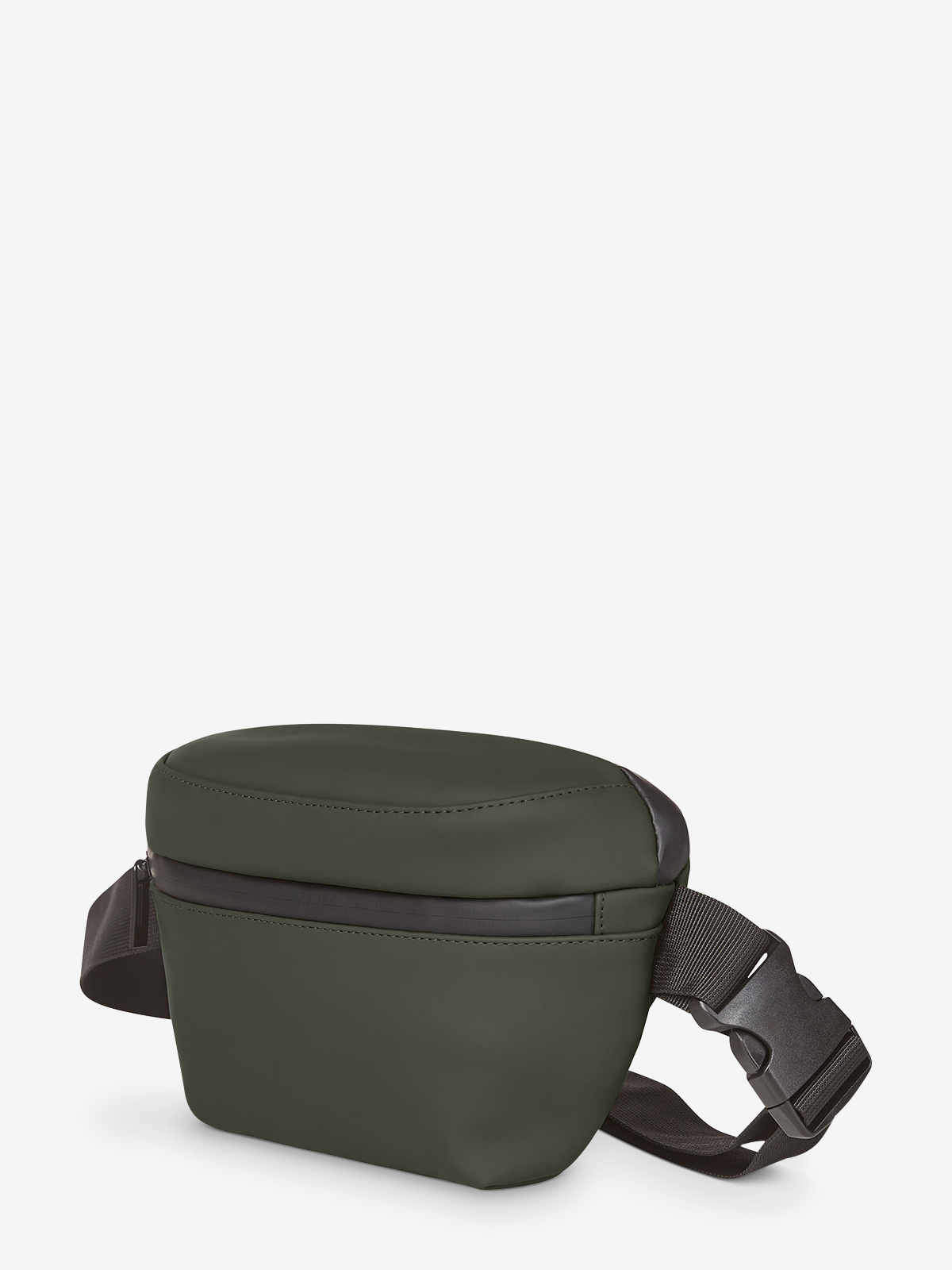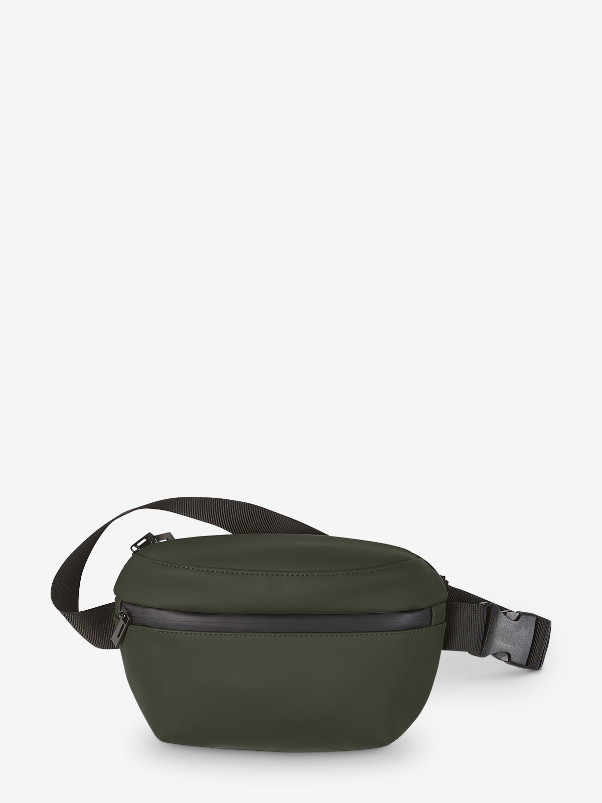 trendy hip bag; main compartment with 2-way zipper and flat inner pocket; water-repellent zippers; front pocket with zipper; adjustable strap with elastic flap to secure the strap; can be worn as a hip or body bag; large side buckle for easy opening and closing