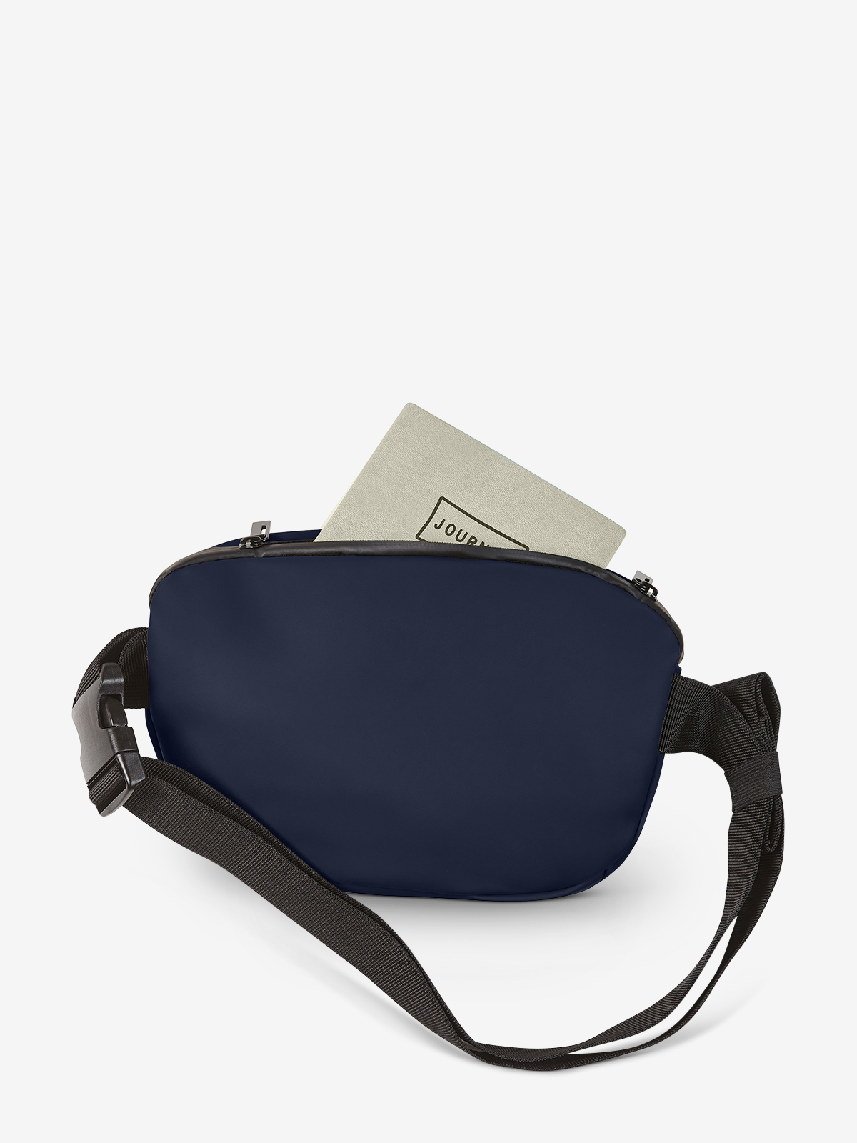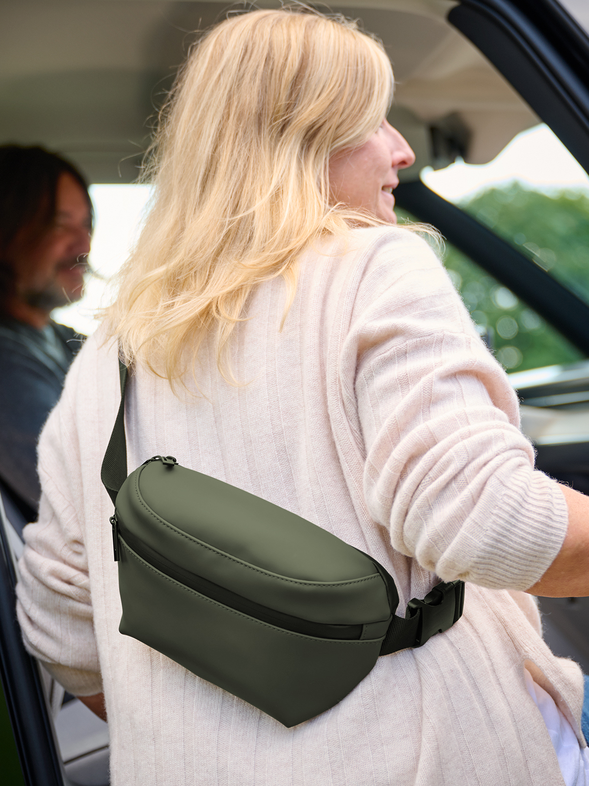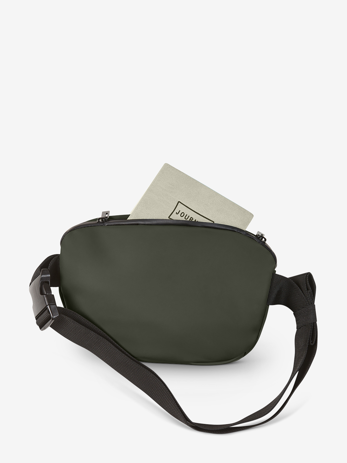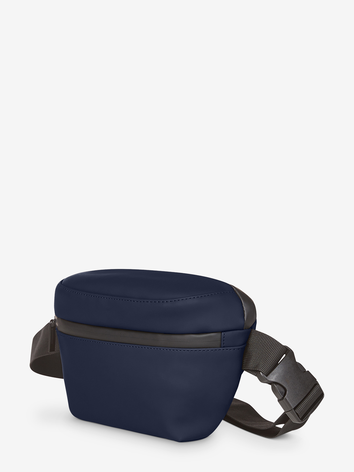 trendy hip bag; main compartment with 2-way zipper and flat inner pocket; water-repellent zippers; front pocket with zipper; adjustable strap with elastic flap to secure the strap; can be worn as a hip or body bag; large side buckle for easy opening and closing