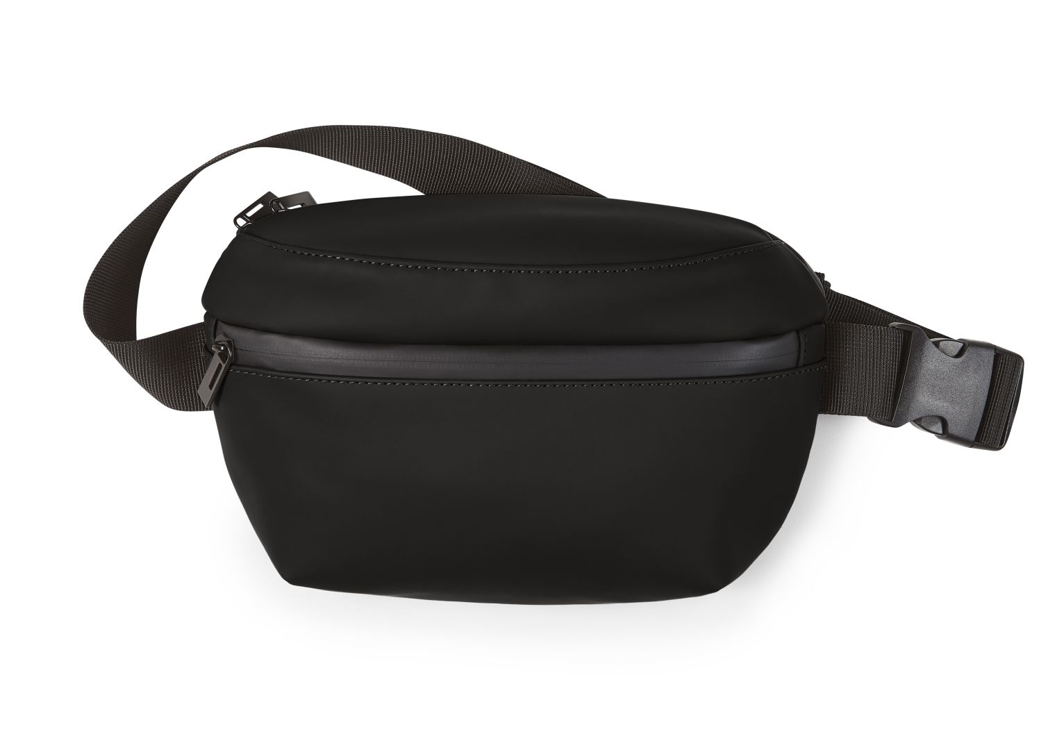 trendy hip bag; main compartment with 2-way zipper and flat inner pocket; water-repellent zippers; front pocket with zipper; adjustable strap with elastic flap to secure the strap; can be worn as a hip or body bag; large side buckle for easy opening and closing
