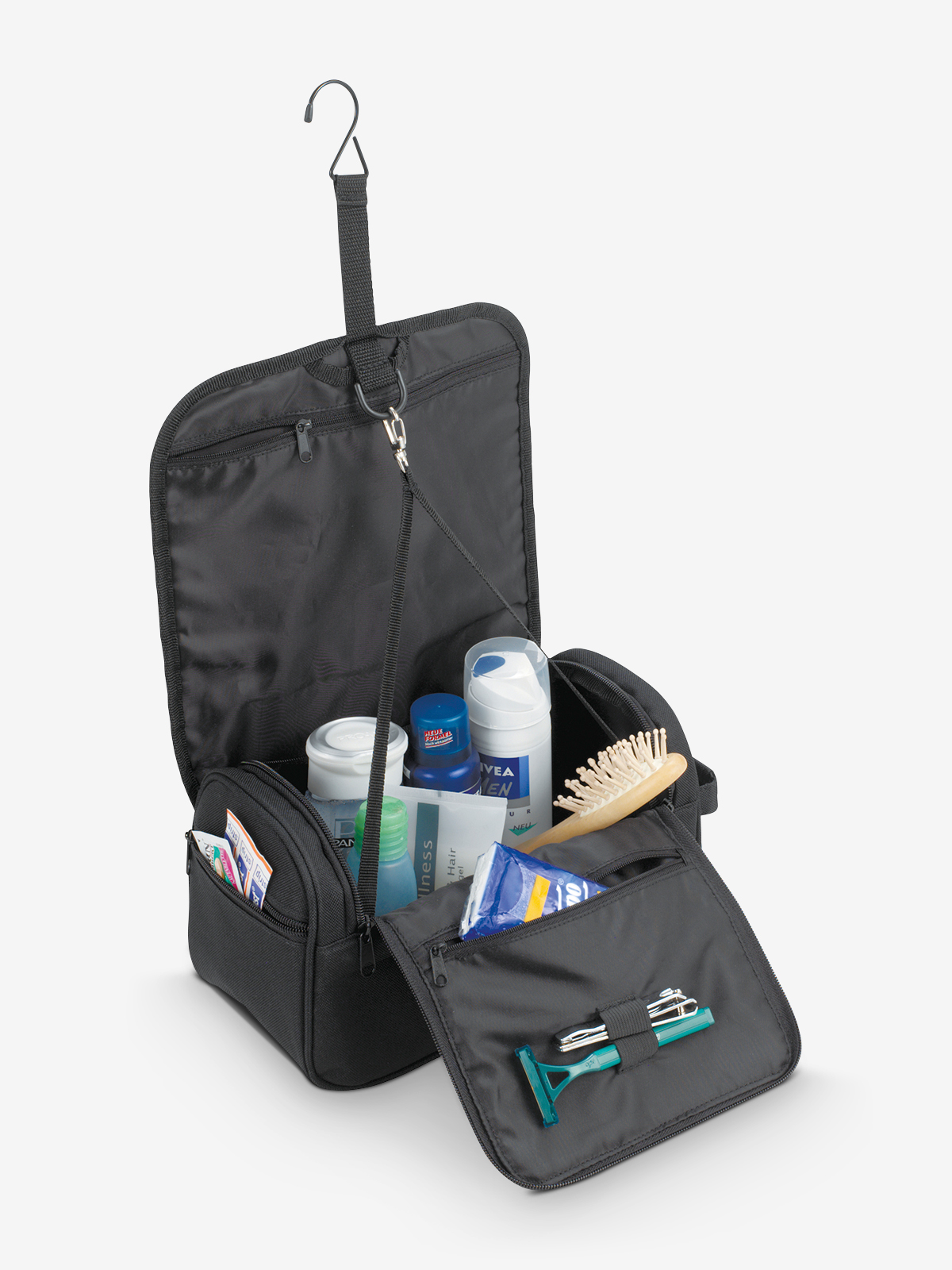 Who doesn't want to arrive feeling groomed and fresh after a long journey? HALFAR® has developed some great solutions for this purpose in bag form. The wash bag BUSINESS awaits with an extensive interior. With a padded main compartment and two inside zipper compartments, it offers plenty of room for small bottles, tubes and jars. Practical: The little black number from HALFAR® can be stood up or hung. When folded up, the wash bag BUSINESS shows off its best side with a printed or embroidered logo.