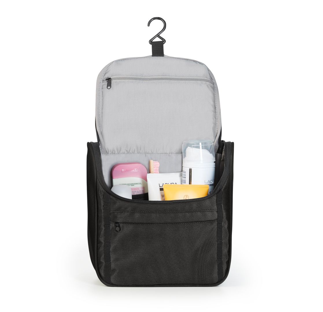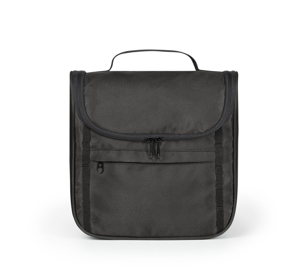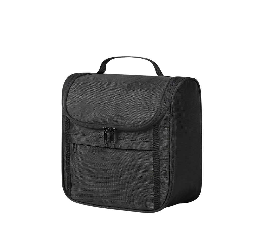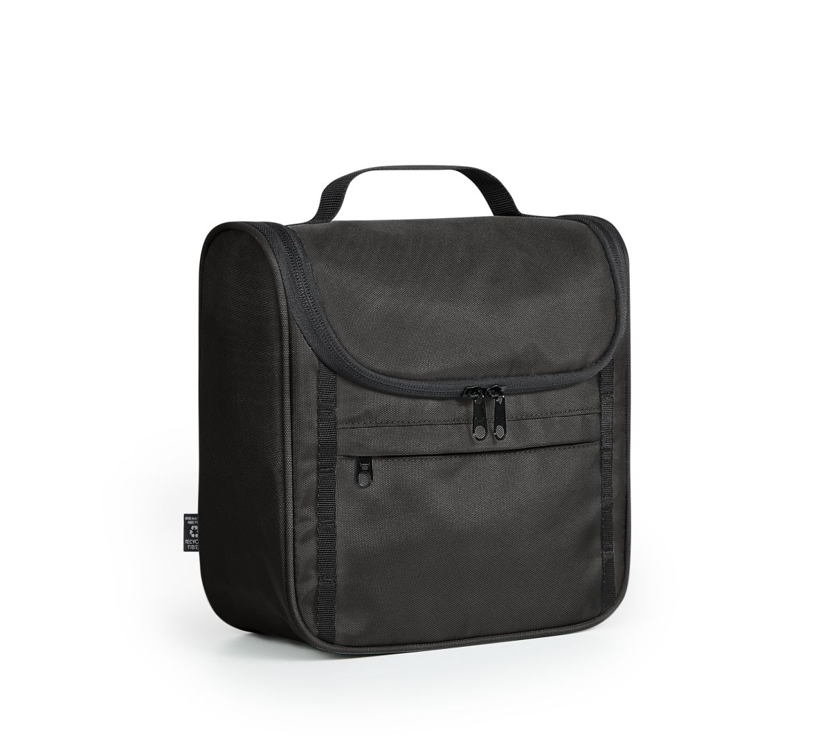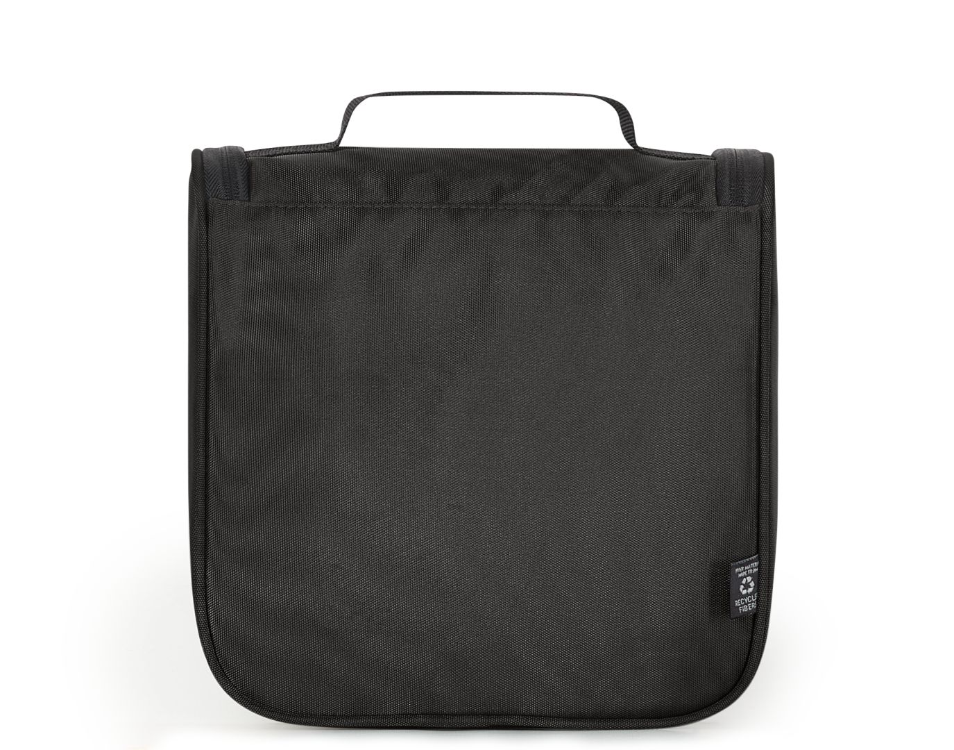 attractive hanging or standing toiletry bag; recycled outer fabric; zippered front pocket; front loop strap; three-sided 2-way zipper; zippered pocket in lid; four mesh pockets inside; handle