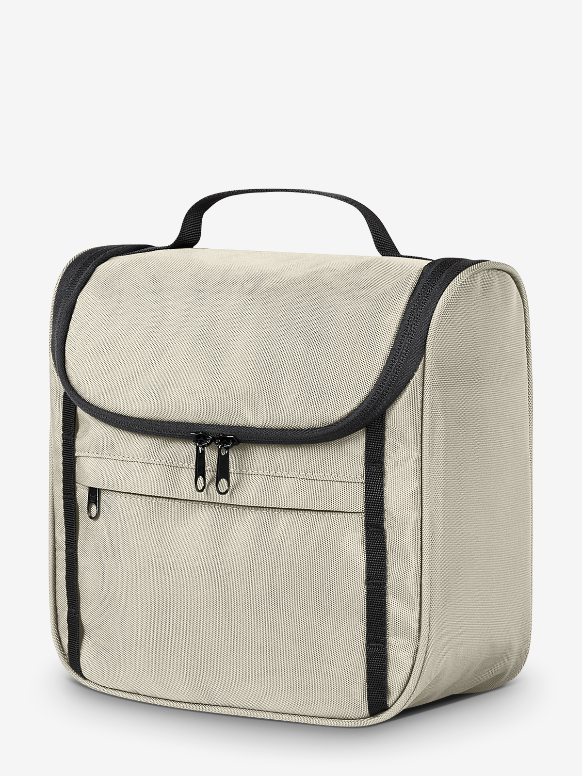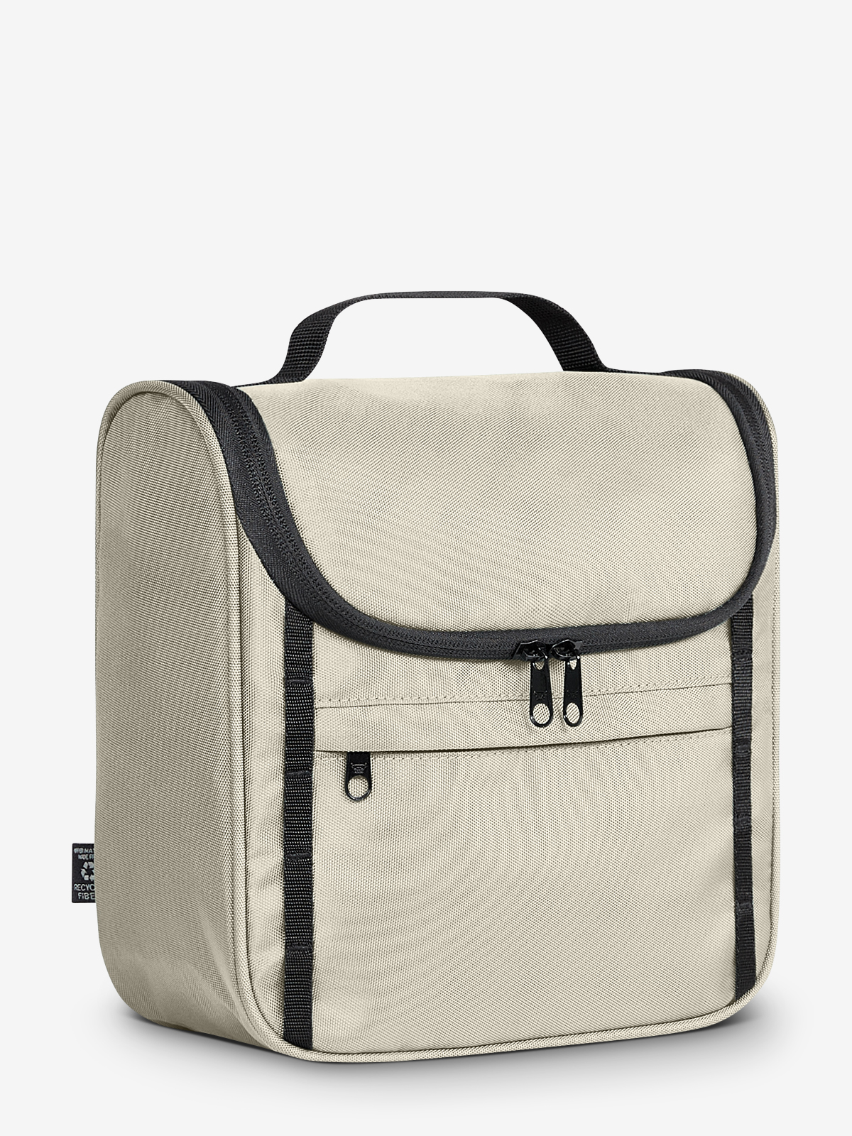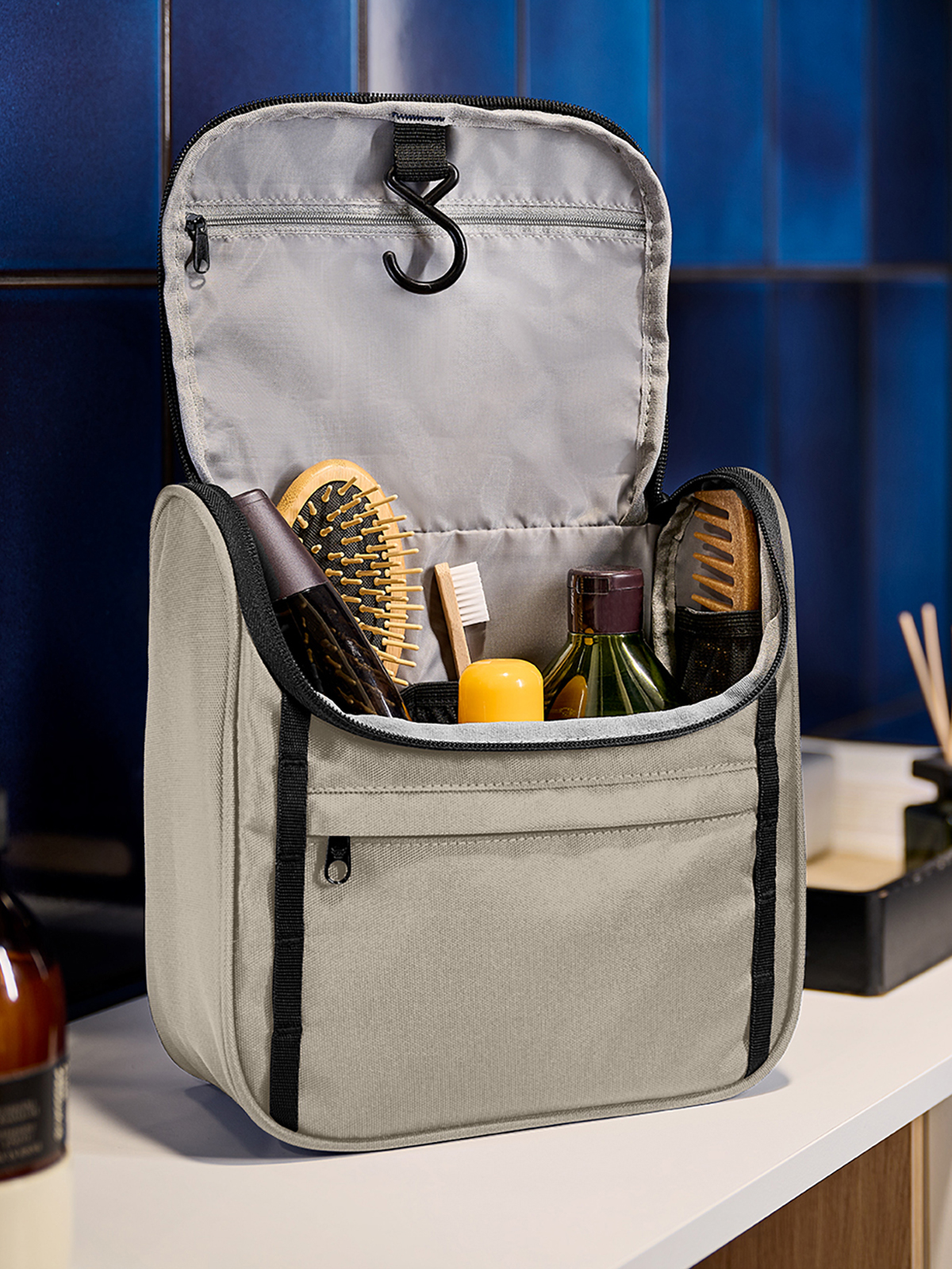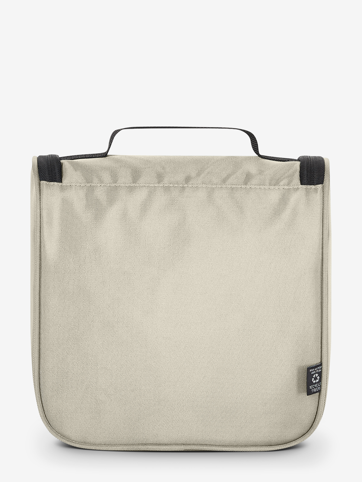 attractive hanging or standing toiletry bag; recycled outer fabric; zippered front pocket; front loop strap; three-sided 2-way zipper; zippered pocket in lid; four mesh pockets inside; handle
