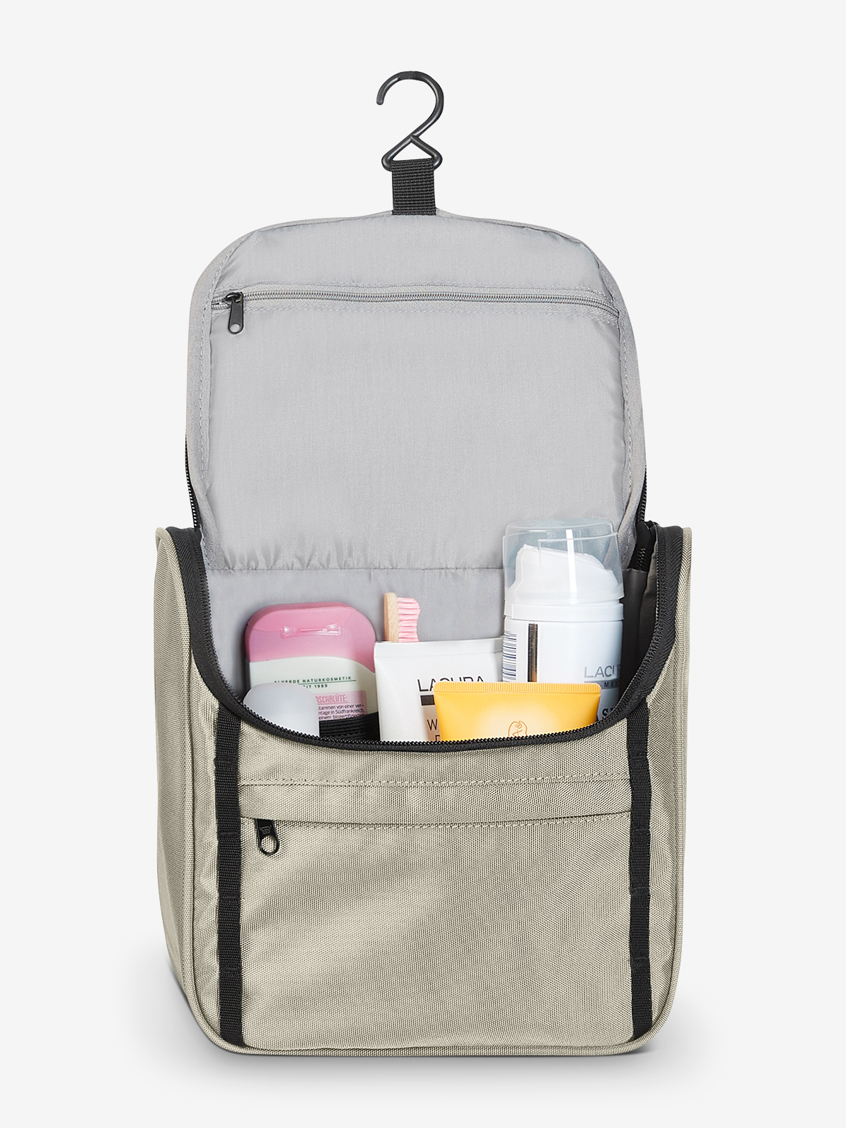 Shampoo bottle, perfume bottle, toothpaste... there are lots of things in the bathroom that you would rather have stood up than lying around. “Wouldn't it make sense for a wash bag to have an upright format?” our designers asked. And with FLEX, they provide the right answer. Its large opening presents the contents almost like your bathroom cabinet at home. This means that nothing has to be unpacked, everything is directly in view and within reach - or discreetly stowed away in the front or inside pocket with zip. The loop strap at the front offers an extra possibility to put more inside and mesh pockets organise the contents. The lightweight bag with the shiny recycled outer material and grey lining also looks really good - whether it is standing or hanging on the integrated hook.