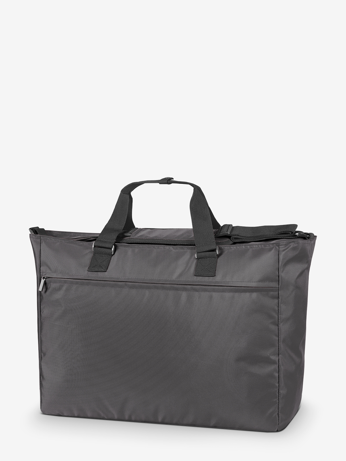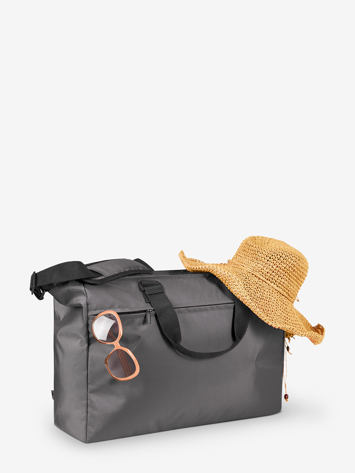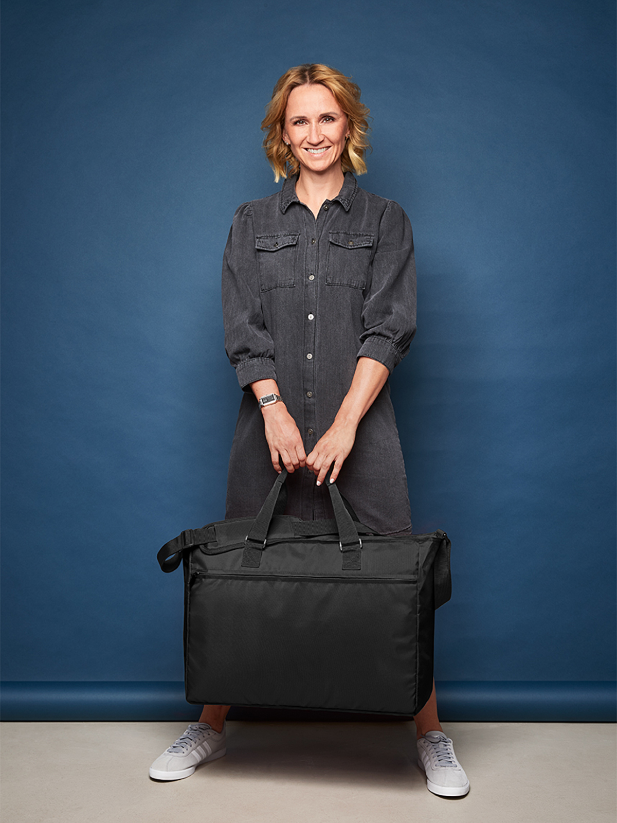 Modern, lightly padded weekender; rPET outer material; large main compartment with 2-way zip; zipped front pocket; flat zipped compartment inside; adjustable shoulder strap on both sides with sewn shoulder pad; handles with press stud cuff