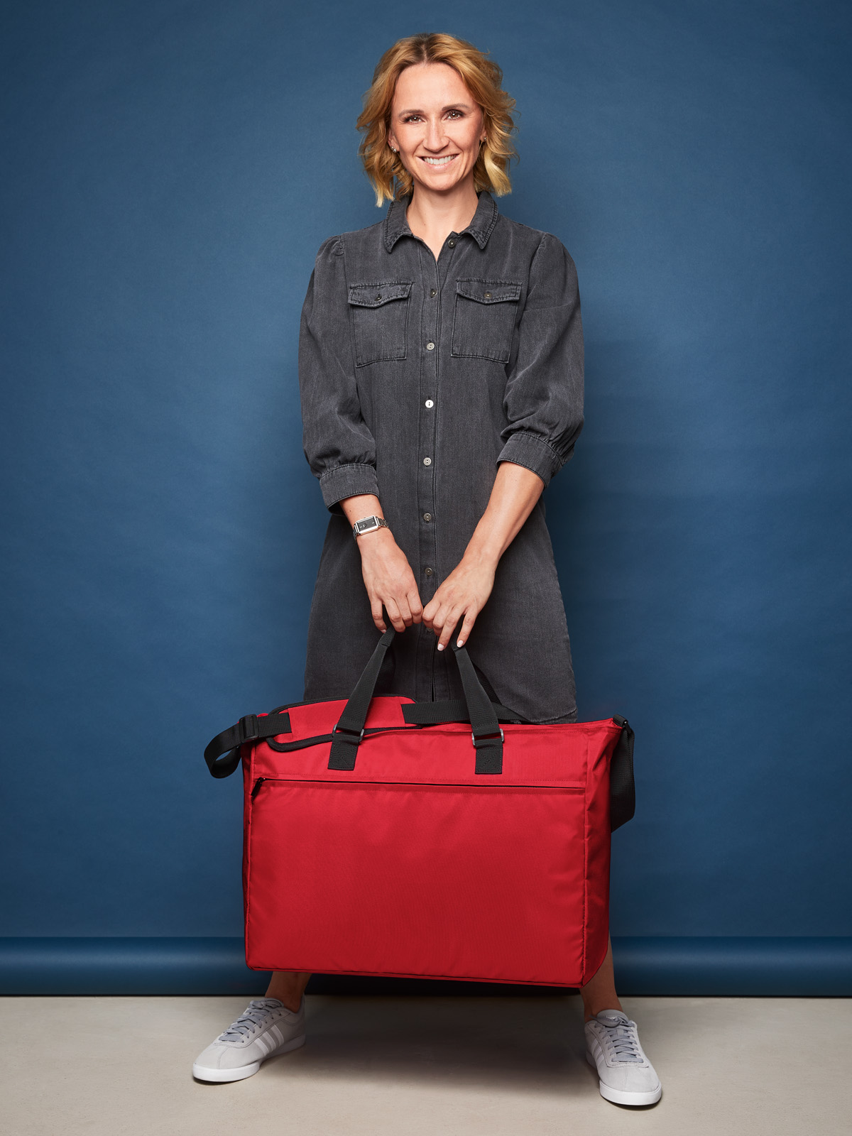Modern, lightly padded weekender; rPET outer material; large main compartment with 2-way zip; zipped front pocket; flat zipped compartment inside; adjustable shoulder strap on both sides with sewn shoulder pad; handles with press stud cuff