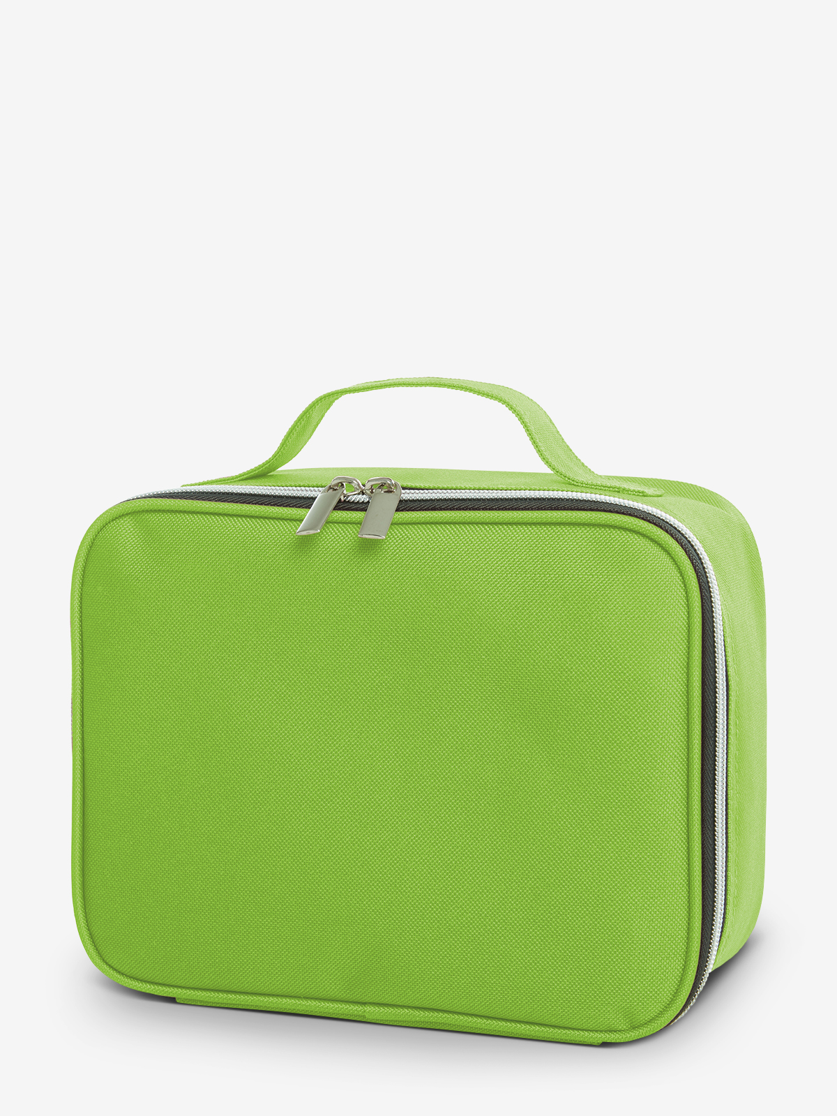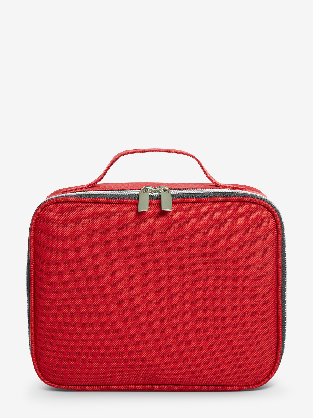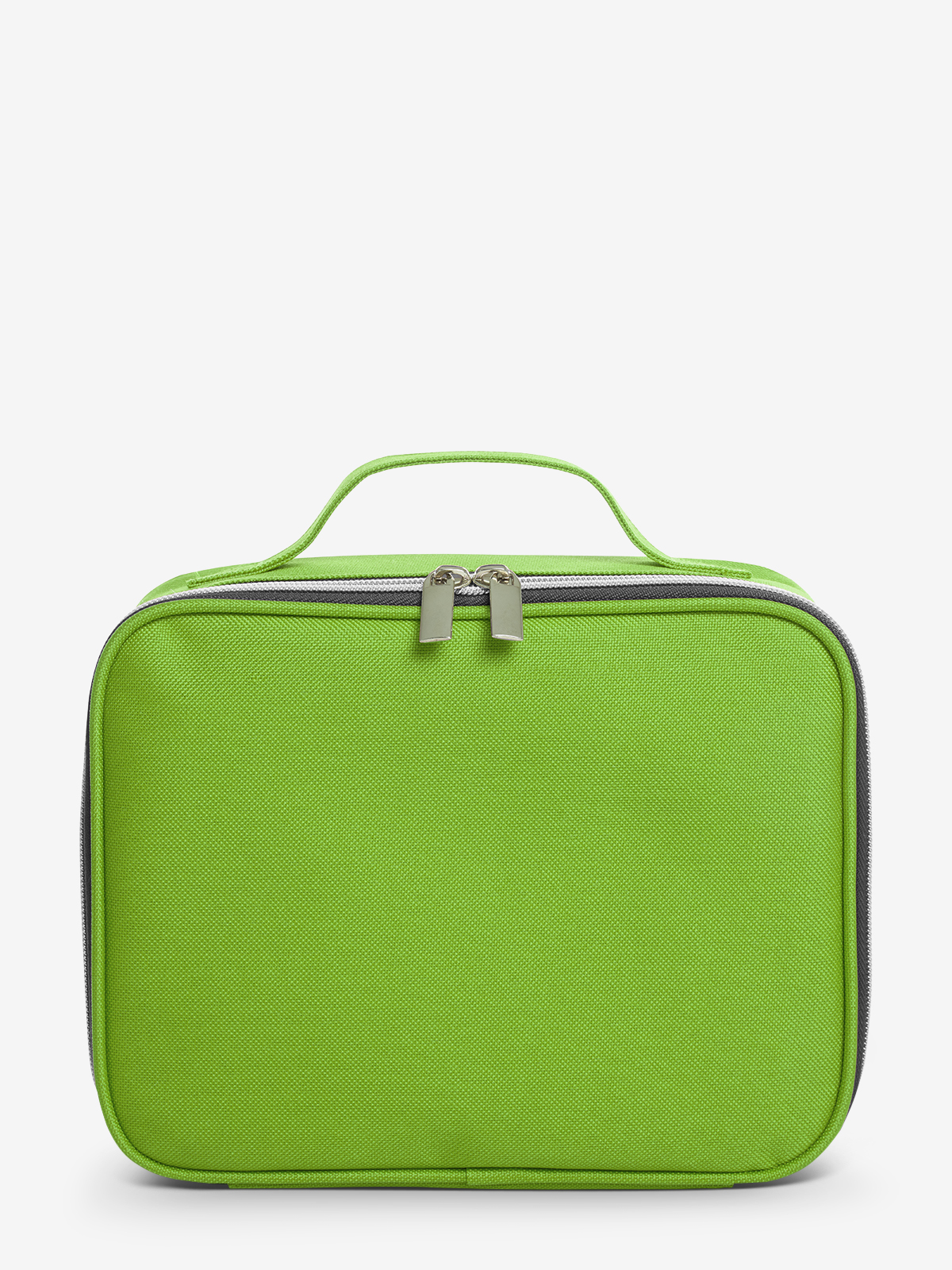 main compartment with wrist strap; silver zipper; insert pouch on the inside