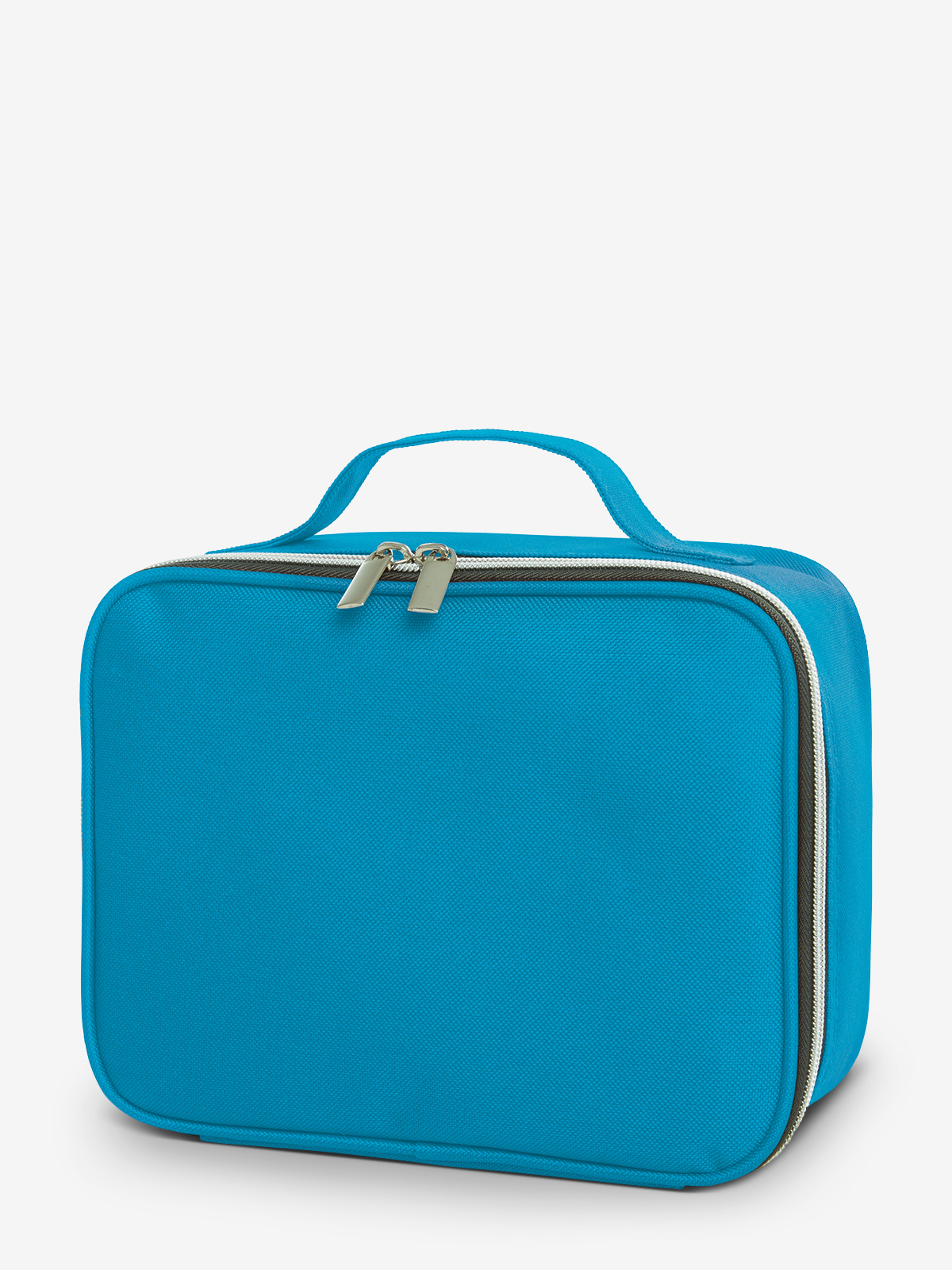 main compartment with wrist strap; silver zipper; insert pouch on the inside