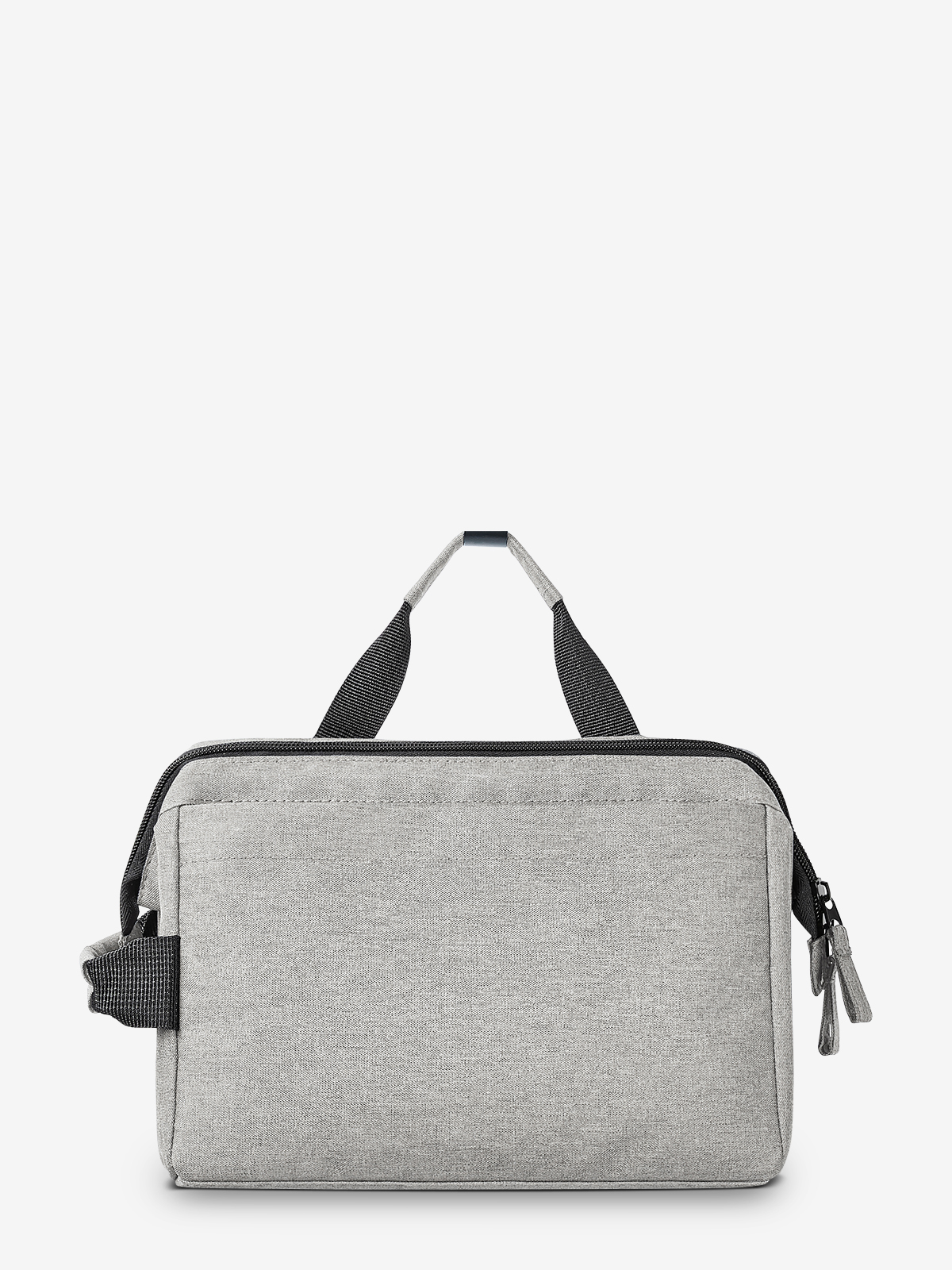 Stylish zip pocket bag with sturdy metal hoop opening for upright standing or hanging; rPET outer material; large, padded main compartment, with various organiser elements; front pocket with zip; handle