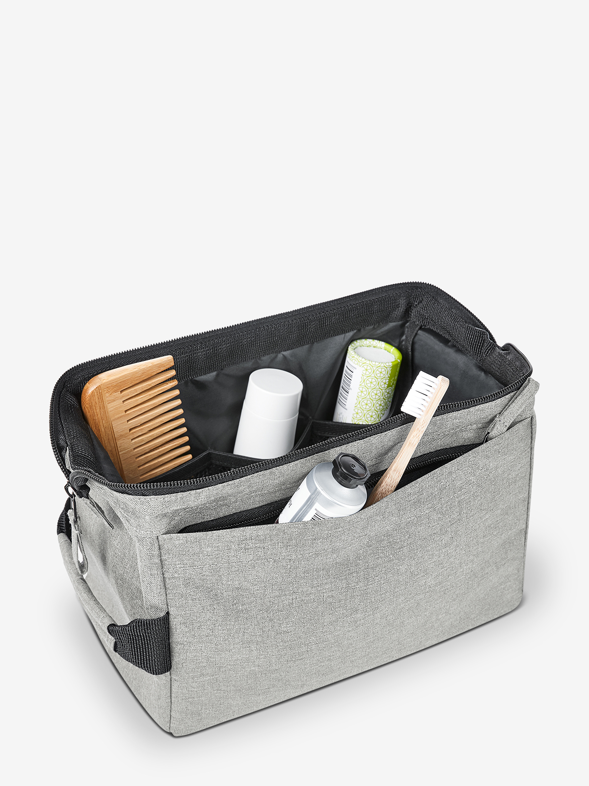 This CIRCLE is a very attractive and highly practical wash bag. And that’s not all: like all zippered bags, it literally packs a lot in. After all, there’s plenty of space to stash things in the compartments and organiser, whether for business, a hobby or for travelling, of course… The CIRCLE bag makes life even easier for people who like everything in its place, who don’t want to rummage around but who always want to see everything at a glance: a metal clasp holds the bag wide open if required. It can also be hung up or placed on its side, plus it’s padded. Another great feature: in the interests of sustainability, the CIRCLE is made with rPET produced from recycled PET bottles.
